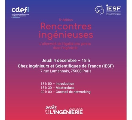 Dans le cadre de son opération annuelle Ingénieuses, la CDEFI organise le 4 décembre 2025 la 5e édition de ses Rencontres Ingénieuses, un afterwork dédié aux questions d'égalité des genres dans les études et carrières d'ingénieur·e·s. L'événement sera accueilli par Ingénieurs et scientifiques de France (IESF), soutien d'Ingénieuses depuis plusieurs années, avec au programme une masterclass visant à donner aux étudiantes et femmes ingénieures des clés pour leur carrière, suivie d'un cocktail de networking avec les nominées et lauréates Ingénieuses ainsi que les partenaires de l'opération.